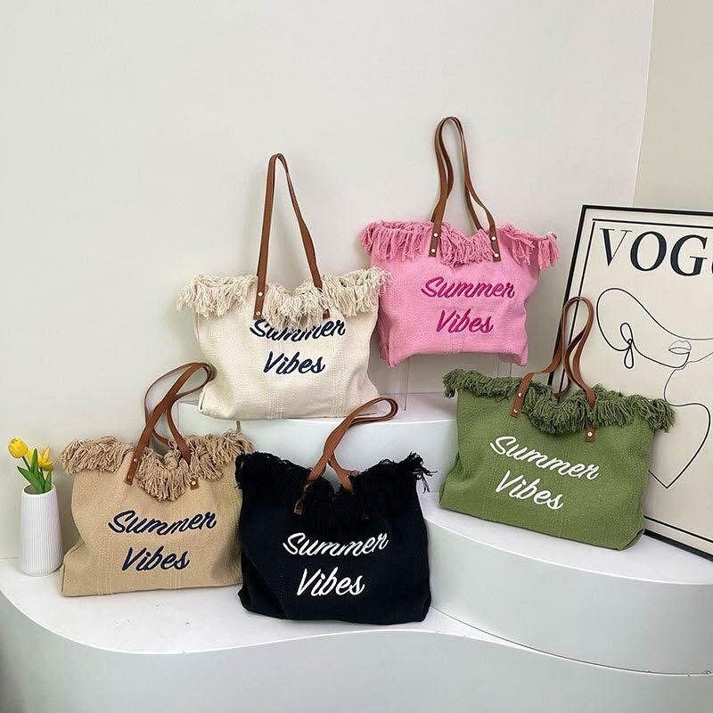 Optez pour un style estival avec ce sac cabas 'Summer Vibes'. Parfait pour la plage, les courses ou une sortie décontractée, il est disponible en plusieurs couleurs vibrantes. Avec ses poignées en simili cuir et son design à franges, il incarne l'élégance décontractée. Idéal pour apporter vos essentiels avec style lors de vos aventures estivales.