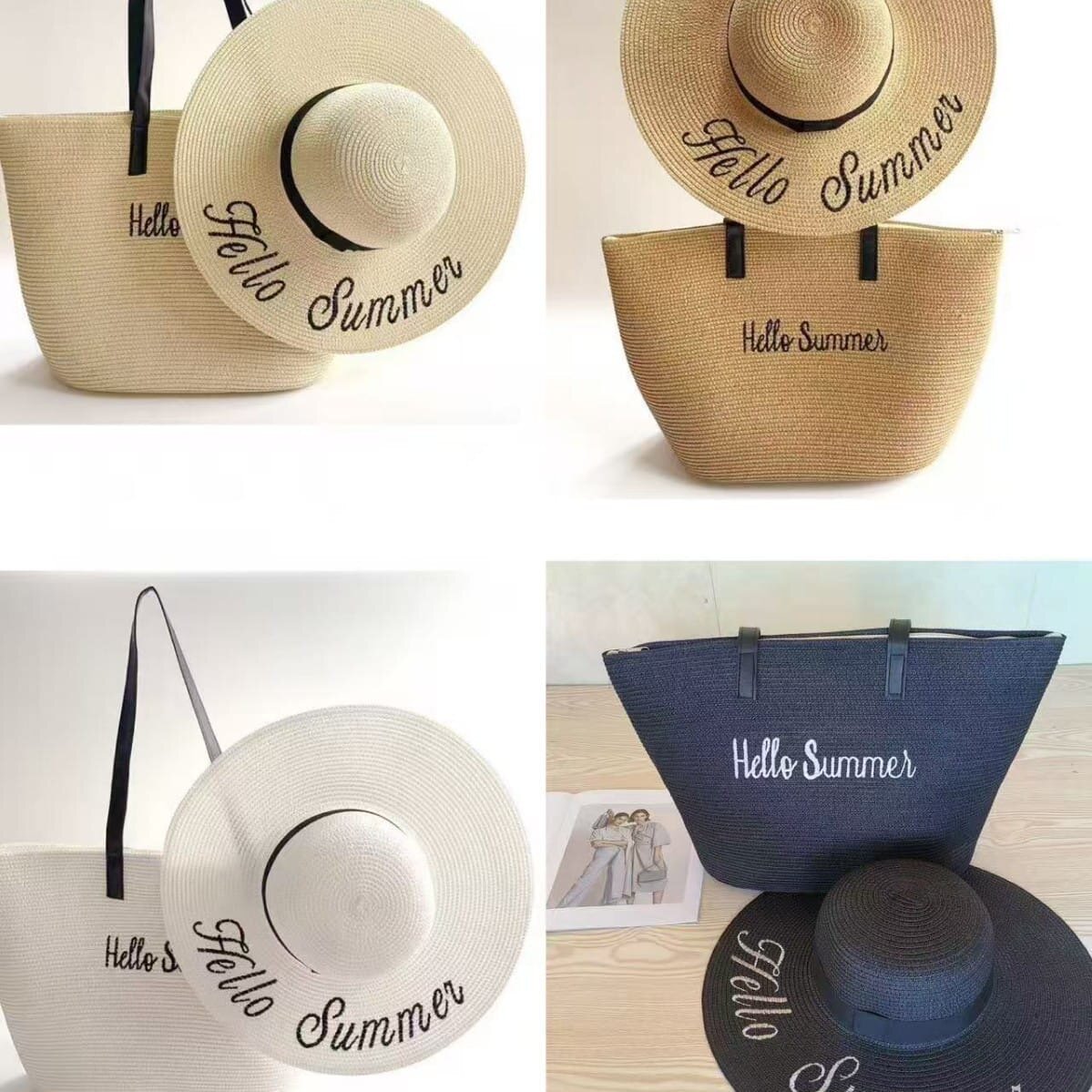 Ensemble élégant de chapeau et sac 'Hello Summer' en paille légère. Idéal pour des journées ensoleillées à la plage ou en ville. Design chic avec une inscription tendance, parfait pour compléter votre look estival.