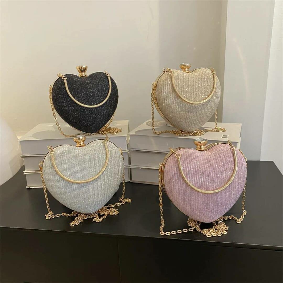 Ajoutez une touche d'élégance à votre tenue avec ce superbe sac de soirée en forme de cœur. Disponible en plusieurs couleurs élégantes et orné de strass scintillants, c'est l'accessoire parfait pour des occasions spéciales. Doté d'une chaîne dorée chic, il se porte facilement à l'épaule. Parfait pour les fêtes, mariages ou soirées.