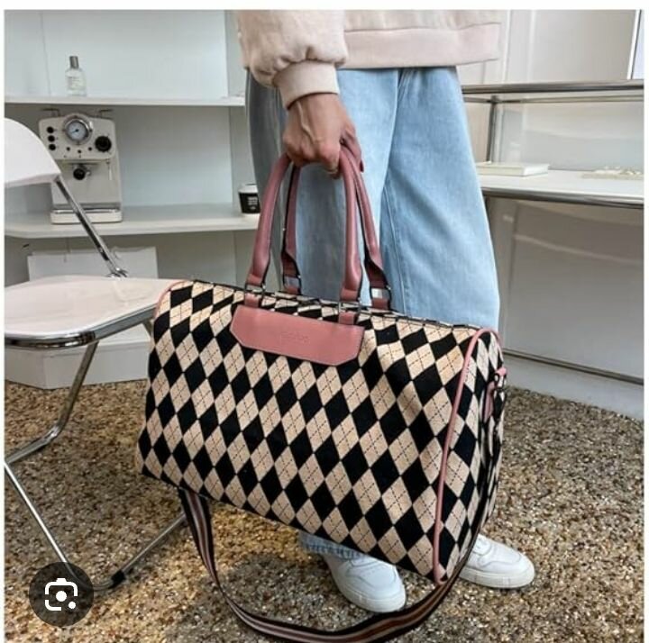 Voyagez avec style grâce à ce sac de voyage chic. Conçu avec un motif à losanges noir et blanc et des poignées roses, il allie tendance et fonctionnalité. Idéal pour les weekends et escapades modernes.