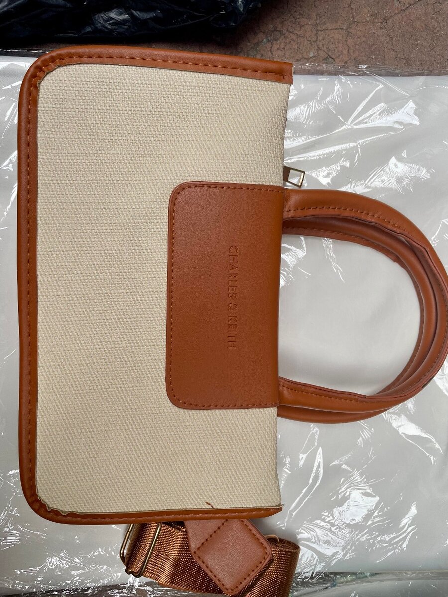 Découvrez cet élégant sac en cuir et toile, idéal pour une tenue chic et décontractée.