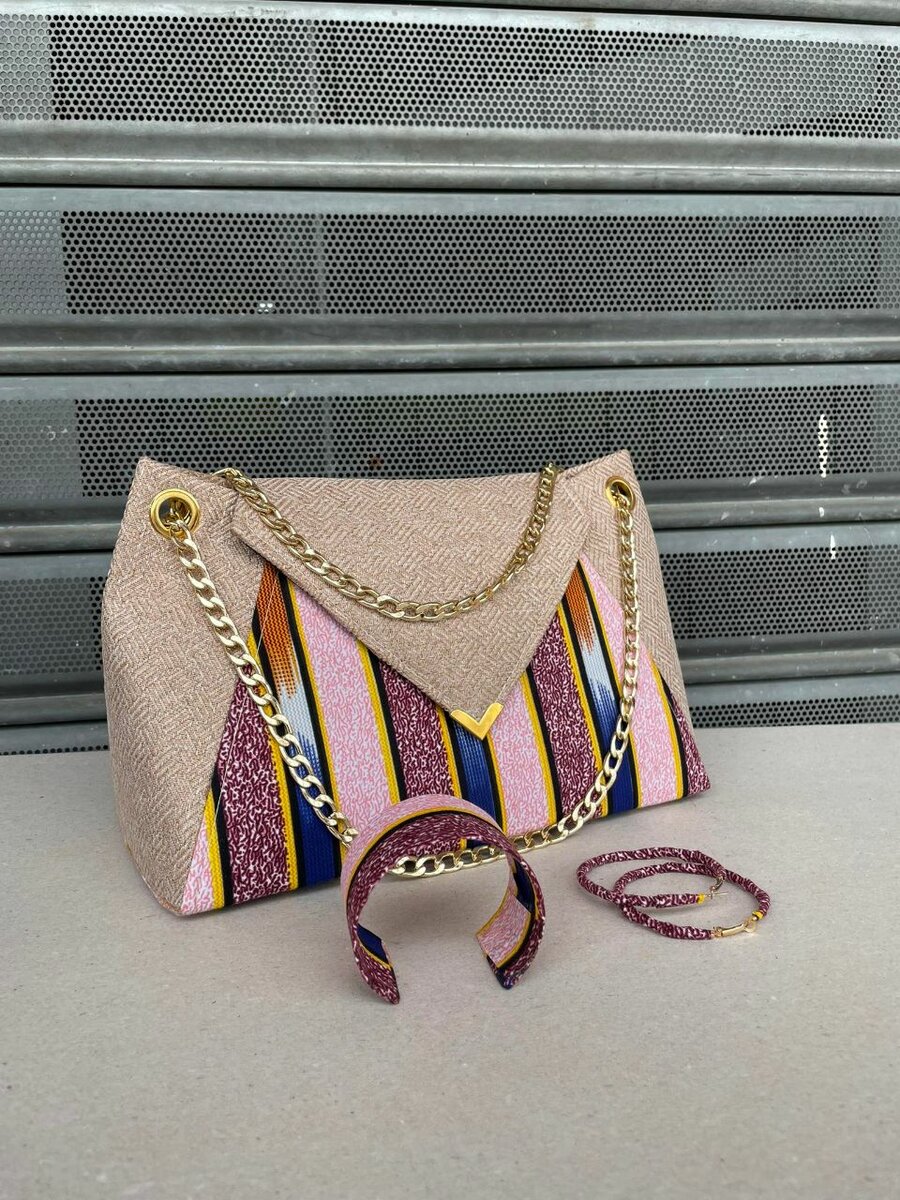 Ajoutez une touche vibrante à votre look avec ce sac en tissu africain. Conçu avec des couleurs audacieuses et une chaîne dorée, c'est le choix parfait pour les sorties ou les événements spéciaux. Léger et spacieux, il vous permet de garder vos essentiels à portée de main. Faites sensation avec ce modèle unique!
