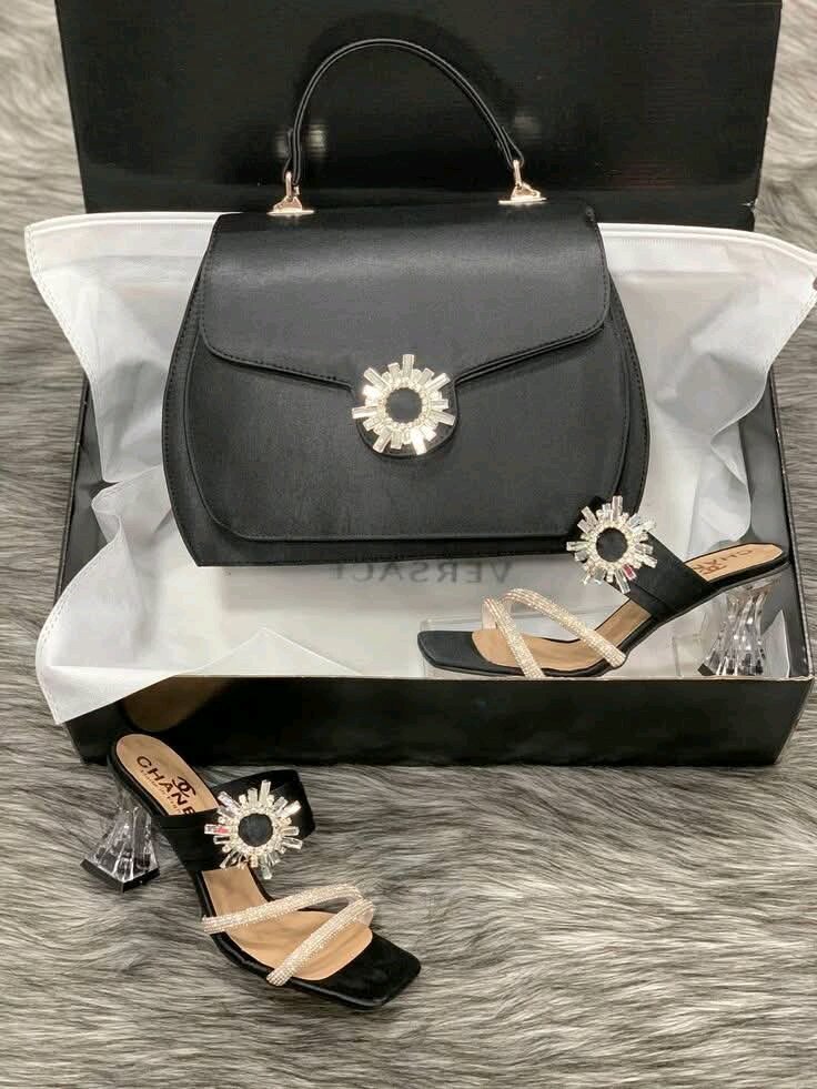Ensemble élégant de sac noir et sandales à talons avec détails en strass. Idéal pour les occasions spéciales ou une sortie nocturne.