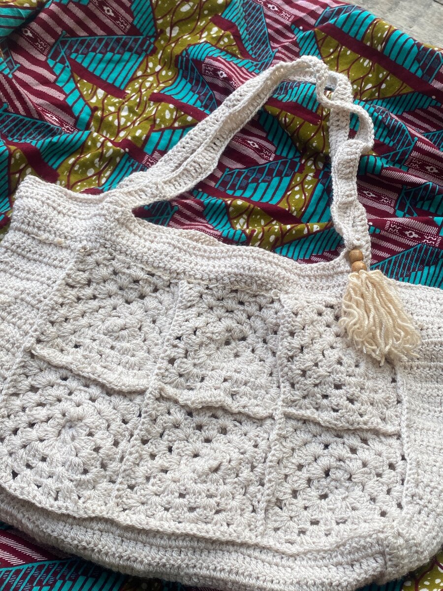 Découvrez ce magnifique sac fourre-tout en crochet au style bohème parfait pour les sorties estivales ou pour compléter votre tenue décontractée. Spacieux et élégant, il est idéal pour transporter vos livre et autre.