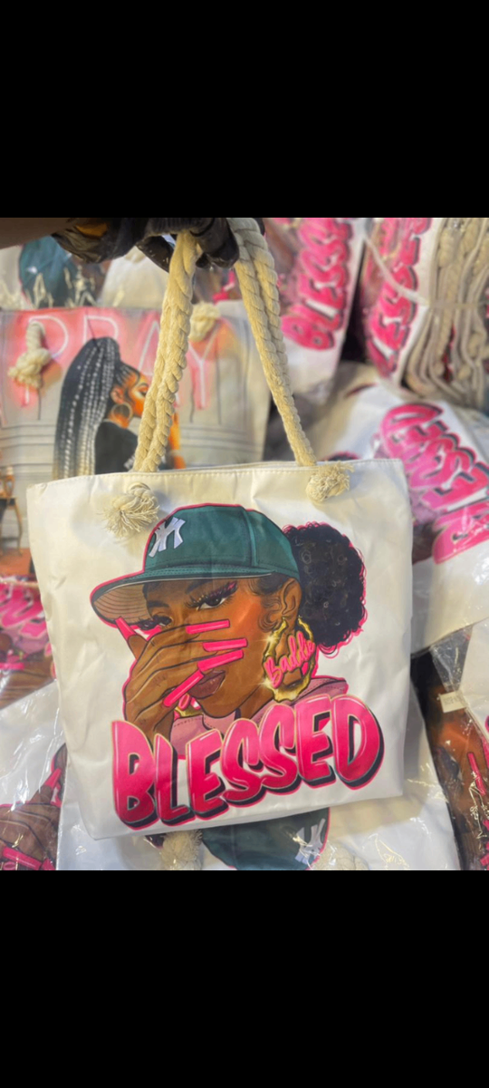 Exprimez votre style avec le sac fourre-tout "Blessed". Fabriqué en toile durable, ce sac présente un design coloré et vibrant, avec une illustration accrocheuse et des poignées en corde robustes. Parfait pour le shopping, la plage ou un usage quotidien, ce sac allie mode et fonctionnalité. Idéal pour ceux qui cherchent à ajouter une touche de personnalité à leur tenue.