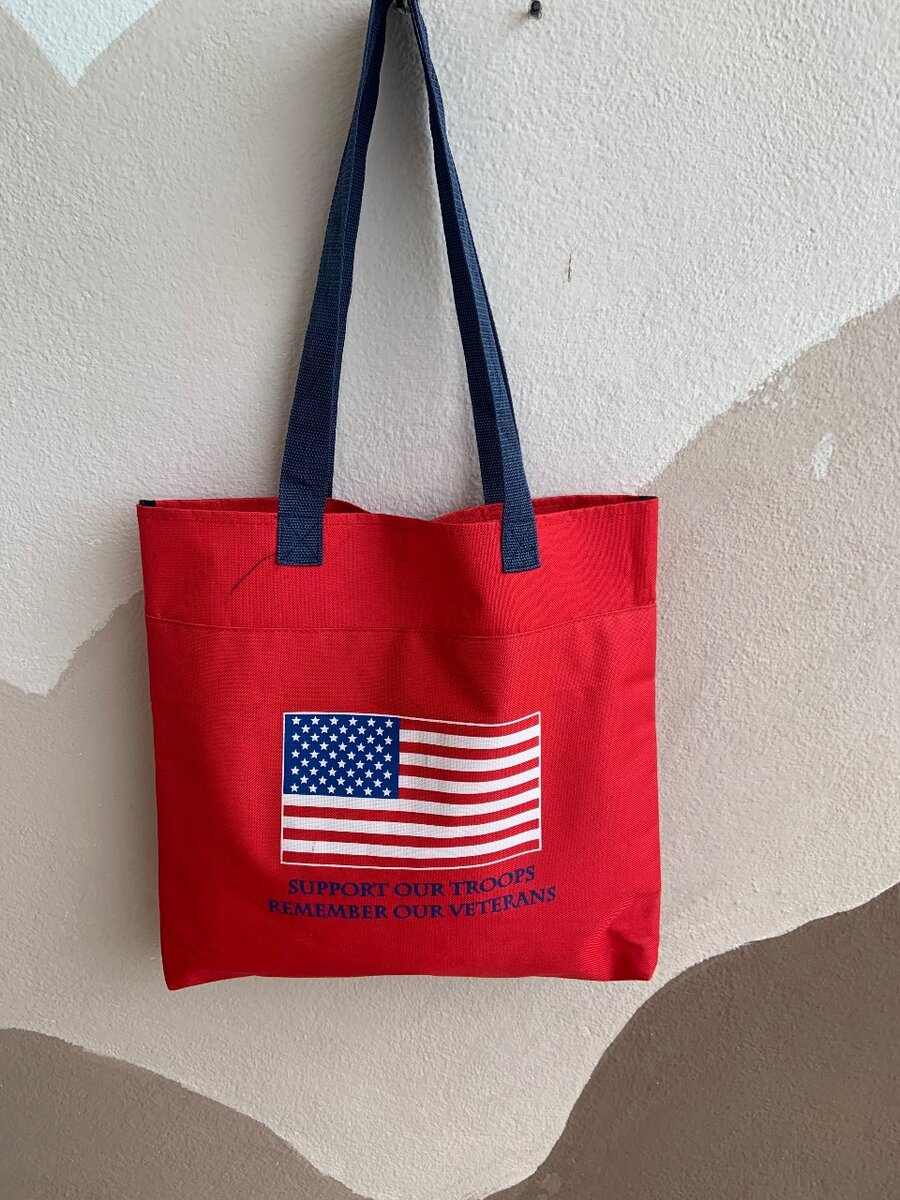 Sac fourre-tout en toile rouge avec drapeau américain. Idéal pour les courses et les sorties. Soutenez nos troupes et honorez nos vétérans avec style. Durable et spacieux.