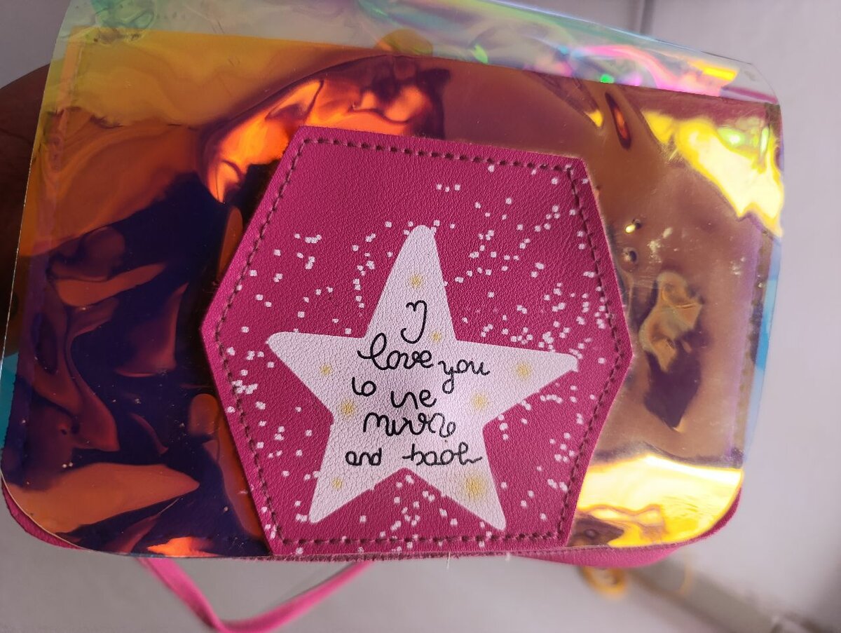 Ce sac à bandoulière holographique est parfait pour ajouter une touche glamour à votre tenue. Idéal pour les occasions spéciales ou un usage quotidien, il combine style et praticité. Avec une étoile et un message unique, il reflète votre personnalité éclatante. Un choix parfait pour les amoureux de la mode audacieuse.