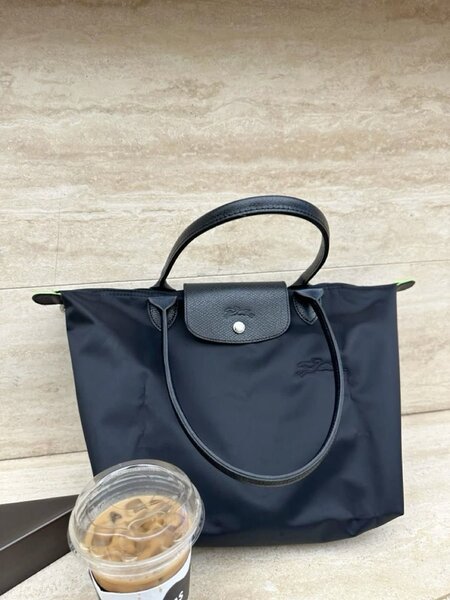 Élégant sac cabas Longchamp en nylon marron avec détails en cuir, poignées en tissu. Léger et pratique, idéal pour le quotidien ou les sorties.