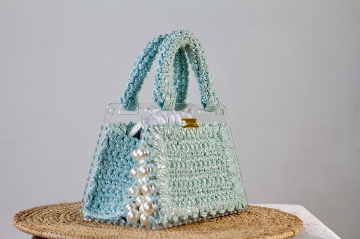 Alliage de laine brillante avec des perles , le tout sur des bases acryliques transparentes avec des mesures uniques