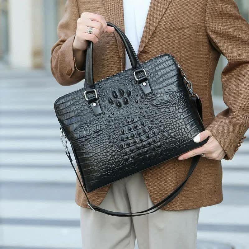 Optez pour cette sacoche en cuir noir au design crocodile pour un look professionnel et sophistiqué. Idéale pour transporter votre ordinateur portable et documents avec élégance. Parfaite pour hommes d'affaires en déplacement. Fabriquée avec des matériaux de haute qualité offrant durabilité et style.