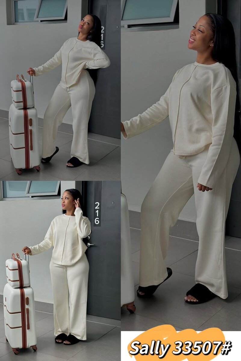 Ensemble survêtement Sally 33507# en blanc pour femme. Confortable et élégant, parfait pour voyager ou se détendre à la maison. Tissu doux et confortable.