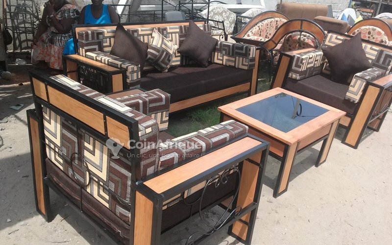 Découvrez ce salon complet en fer au design moderne et élégant. Idéal pour meubler votre salon avec style et confort. Profitez de sièges confortables avec des motifs géométriques et des coussins douillets. Parfait pour recevoir vos invités et créer une ambiance chaleureuse.