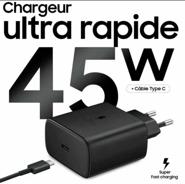 Experience rapid charging with the Samsung 45W Super Fast Charger. Ideal for USB-C devices, this compact power adapter ensures efficient and speedy charging. Perfect for home, office, or travel. Stay powered up and ready to go.
