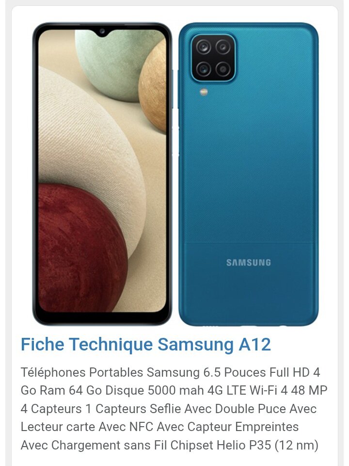 Découvrez le Samsung A12, un smartphone compact et performant avec écran 6.5 pouces Full HD. Doté de 64 Go de stockage et 4 Go de RAM, il offre une expérience fluide. Capturez des photos étonnantes avec les 4 capteurs de 48 MP et profitez de la technologie NFC pour des paiements sans contact. Idéal pour ceux qui recherchent performance et style!