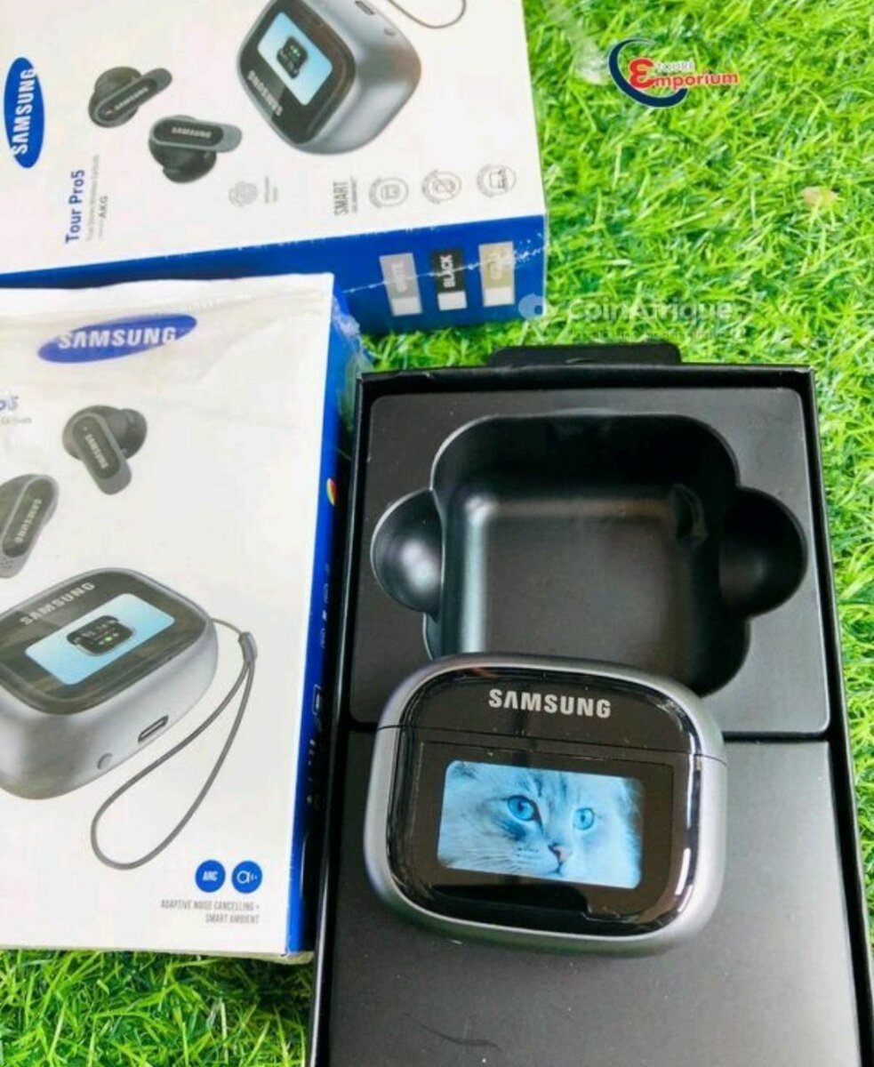 Découvrez les écouteurs sans fil Samsung Tour Pro5. Avec un son de haute qualité signé AKG, profitez de votre musique avec un nouvel éclairage grâce à l'ambiance sonore adaptative. Design élégant avec écran et fonctionnalités avancées pour une expérience audio ultime. Idéal pour les amateurs de musique en mouvement.