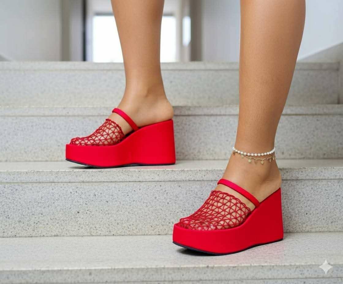 Découvrez ces sandales à plateforme rouge vif, parfaite pour ajouter une touche de style à votre tenue. Avec leur semelle épaisse et leur design élégant, elles sont idéales pour les occasions spéciales ou une sortie en soirée. Les détails en mesh et la sangle fine autour de la cheville ajoutent une touche de sophistication.