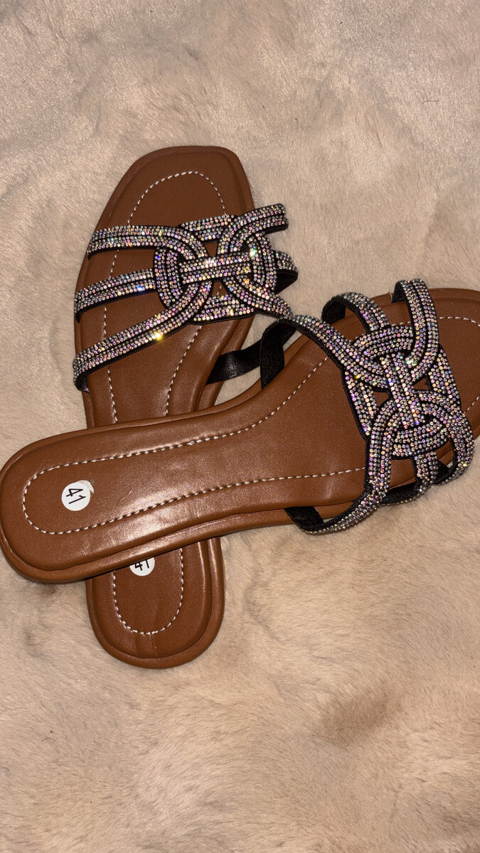 Élégantes sandales plates ornées de strass étincelants pour un look chic et tendance. Idéales pour les occasions estivales et les tenues décontractées, elles allient confort et style. La semelle en cuir assure une marche agréable. Parfaites pour ajouter une touche de glamour à toute tenue.