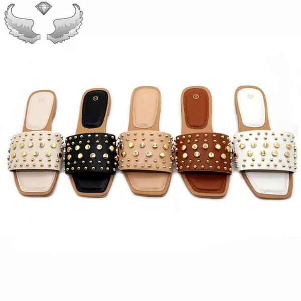 Élégantes sandales à talons plats ornées de clous dorés. Parfaites pour un look chic et confortable en été. Disponibles en plusieurs couleurs.