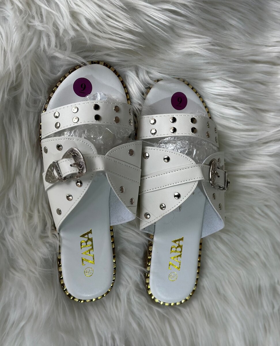 Découvrez nos élégantes sandales blanches ornées de clous et d'une boucle raffinée. Parfaites pour un look chic et tendance cet été. Confort et style assurés.