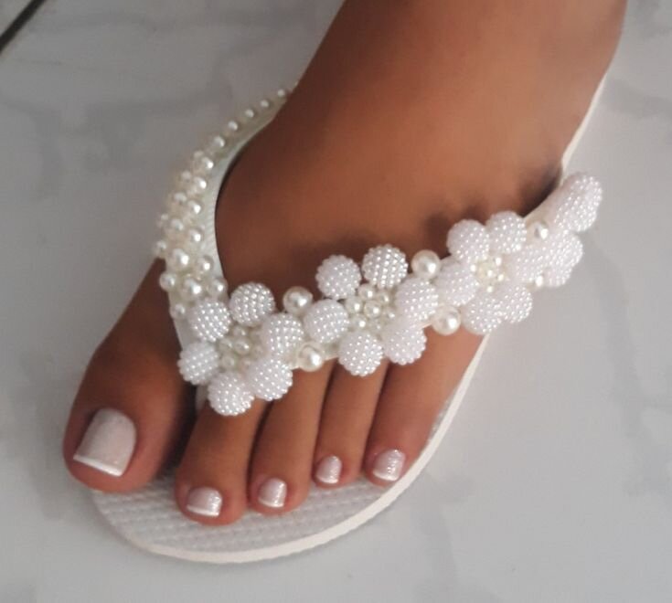 Élégantes sandales de mariage blanches ornées de perles et de fleurs. Conçues pour les mariées et les invitées. Confortables et élégantes.