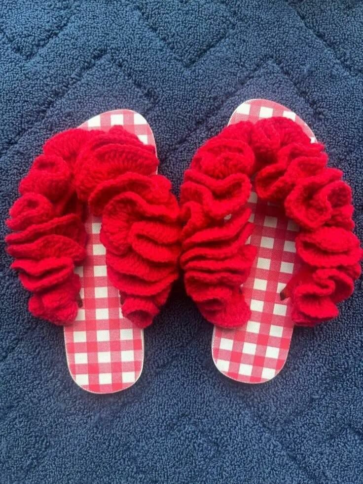 Ajoutez une touche de confort et de style à votre maison avec ces sandales d'intérieur uniques. Dotées de semelles à motif vichy et de magnifiques volants rouges en laine, elles offrent douceur et élégance. Idéales pour se détendre à la maison tout en restant chic.