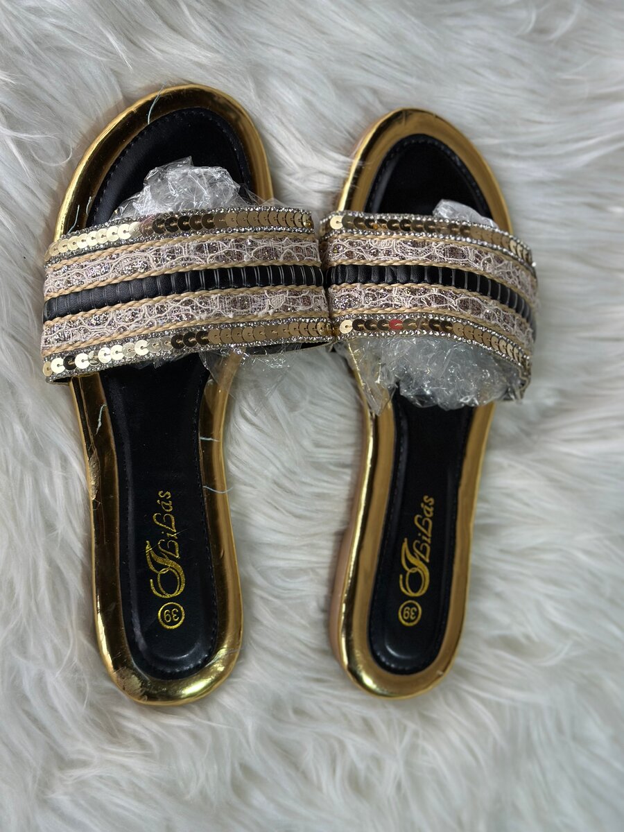Élégantes sandales dorées ornées de sequins scintillants. Parfaites pour ajouter une touche glamour à vos tenues d'été. Confortables et stylées, idéales pour les sorties estivales ou les occasions spéciales.