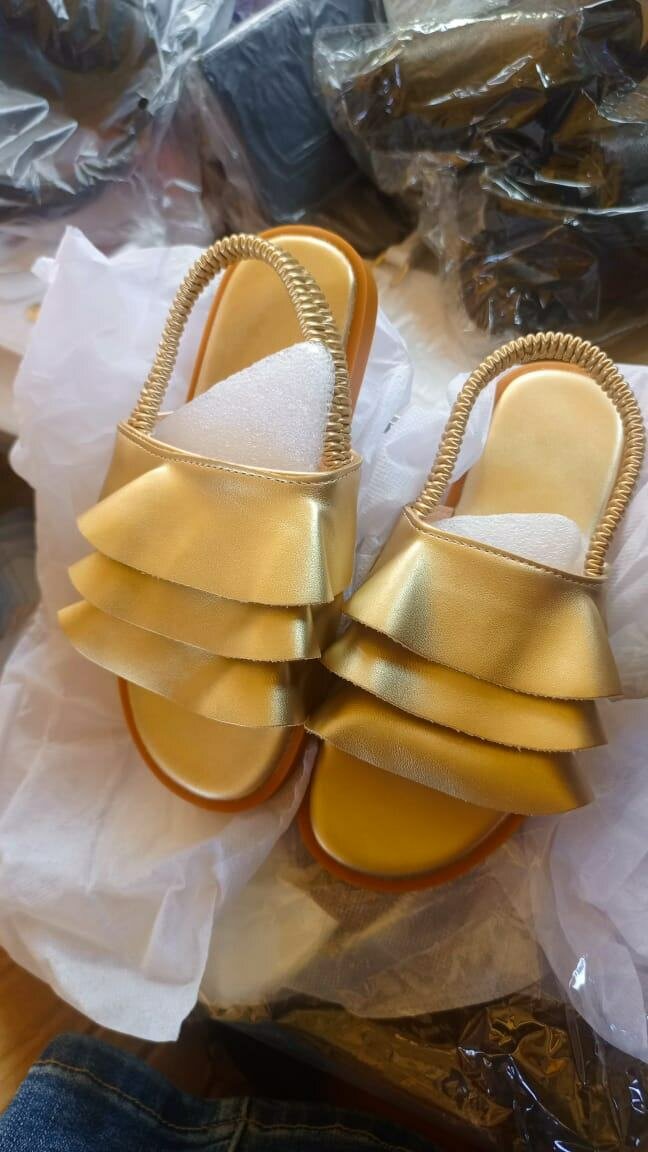 Découvrez ces sandales dorées, idéales pour ajouter une touche chic à votre tenue. Conçues avec des volants élégants, elles sont parfaites pour une soirée d'été ou un événement spécial. Associez-les à une robe légère pour un look estival parfait.