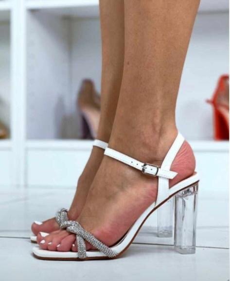Découvrez ces sandales élégantes à talons transparents et lanières blanches ornées de strass scintillants. Parfaites pour une soirée chic ou un mariage, elles ajoutent une touche de glamour à votre tenue. Confortables et stylées, ces sandales sont idéales pour des événements spéciaux ou une sortie entre amis.