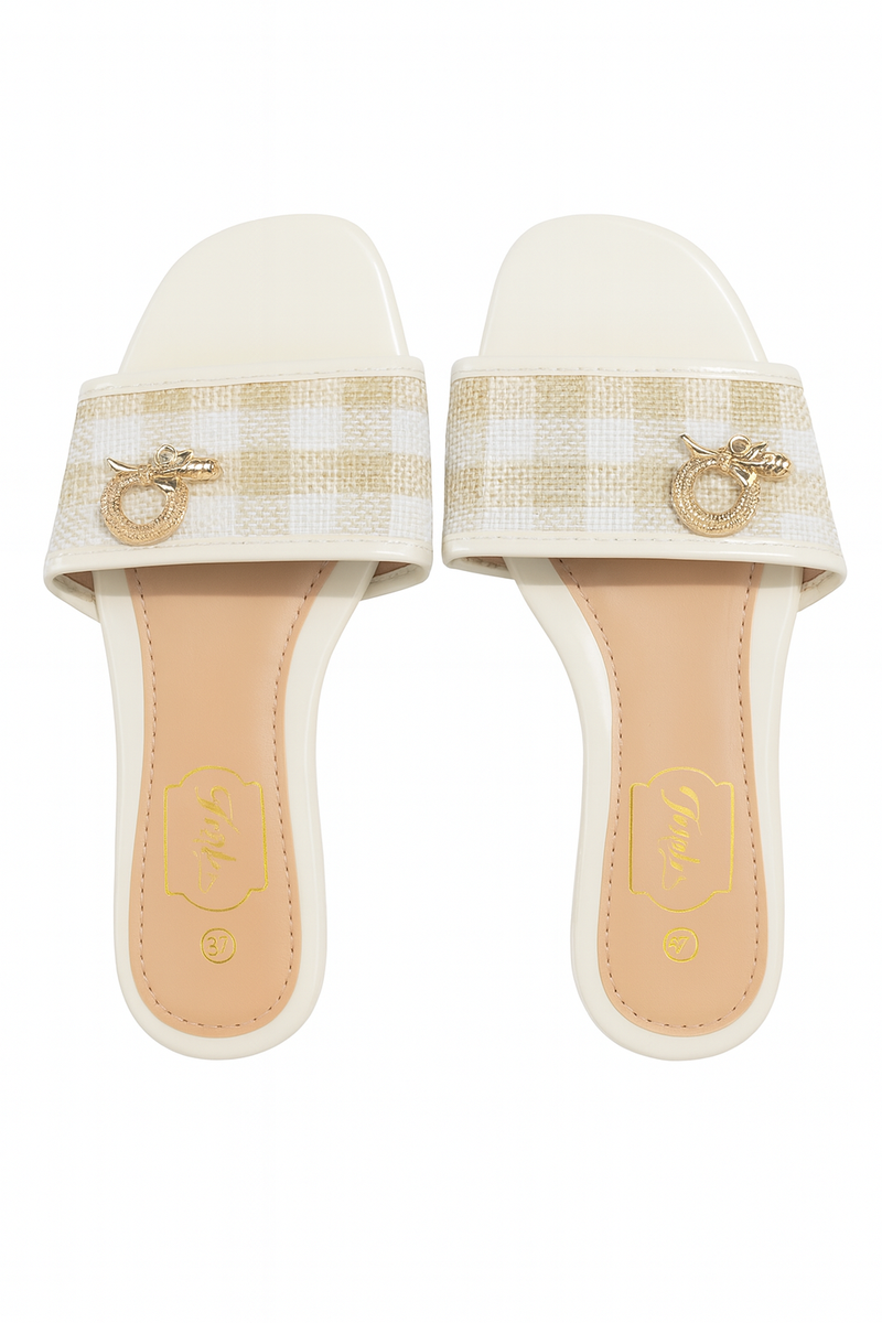Découvrez le confort et le style de ces sandales en cuir élégantes, parfaites pour l'été. Dotées d'un design raffiné avec un motif à carreaux et un ornement doré, elles s'allient parfaitement à une tenue décontractée ou habillée. Idéales pour les promenades en ville ou les soirées d'été.
