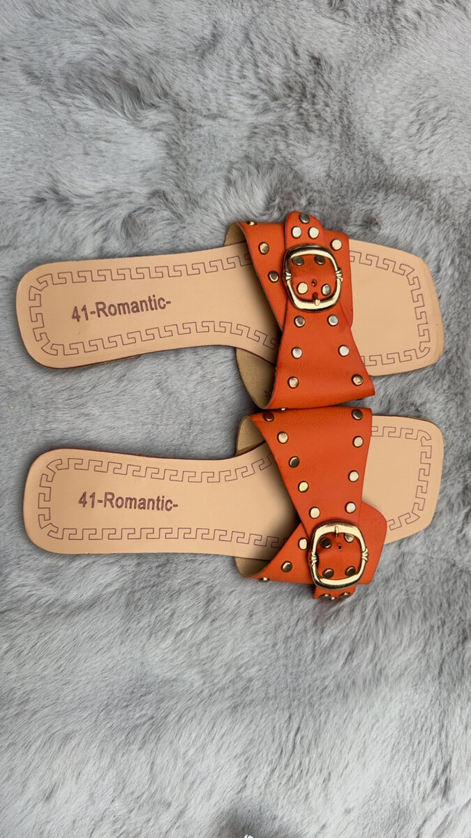 Sandales élégantes en cuir orange avec clous décoratifs et boucles dorées. Idéales pour l'été, elles offrent confort et style. Parfaites pour une tenue décontractée ou chic.