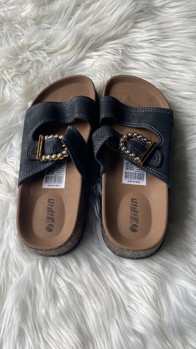 Découvrez ces sandales en cuir noir avec boucles dorées, parfaites pour un confort quotidien et un style chic. Idéales pour les sorties estivales ou à la maison.