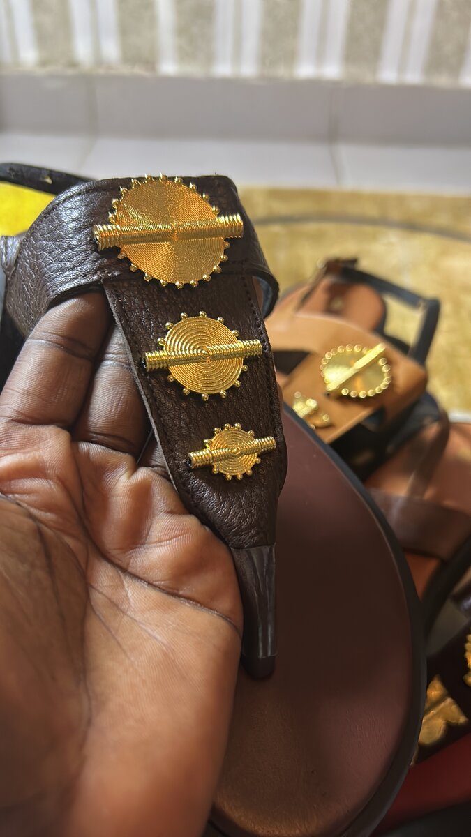 Découvrez ces sandales en cuir ornées de motifs dorés uniques. Parfaites pour un style ethnique chic, elles apportent une touche de sophistication à vos tenues estivales. Confortables et élégantes, elles sont idéales pour les sorties décontractées ou les événements spéciaux. Fabriquées avec soin pour assurer durabilité et style.