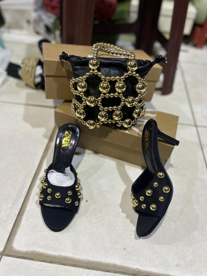 Découvrez l'élégance avec ce duo de sandales et sac à main. Parfait pour une soirée chic ou un événement spécial, ce set ajoute une touche de glamour à votre look. Les sandales sont ornées de perles dorées, tandis que le sac à main assorti complète parfaitement l'ensemble. Idéal pour les femmes soucieuses de la mode et du style.