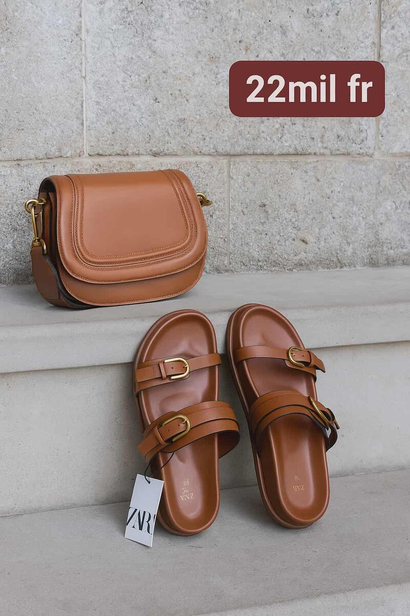 Élégantes sandales en cuir marron avec boucles dorées, parfaites pour un look estival chic. Accompagnées d'un sac assorti, idéal pour les sorties en ville ou les vacances. Confort et style réunis.