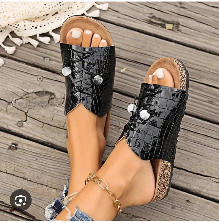 Sandales élégantes à lanières noires avec texture crocodile. Idéales pour l'été, elles offrent confort et style grâce à leur semelle ergonomique. Parfaites pour un look décontracté chic, ces sandales s'accordent facilement avec vos tenues de plage ou de ville.