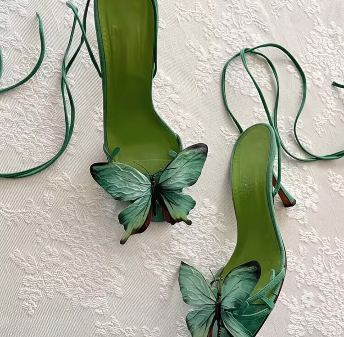 Découvrez ces sandales vertes avec un motif de papillon unique, parfaites pour ajouter une touche de nature et de sophistication à votre tenue. Idéales pour une soirée d'été ou une occasion spéciale, elles combinent style et confort. Ne passez pas à côté de cet accessoire incontournable !