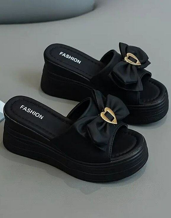 Élégantes sandales noires à plateforme avec nœud en satin et boucle dorée. Confortables et légères, parfaites pour les tenues décontractées ou élégantes.