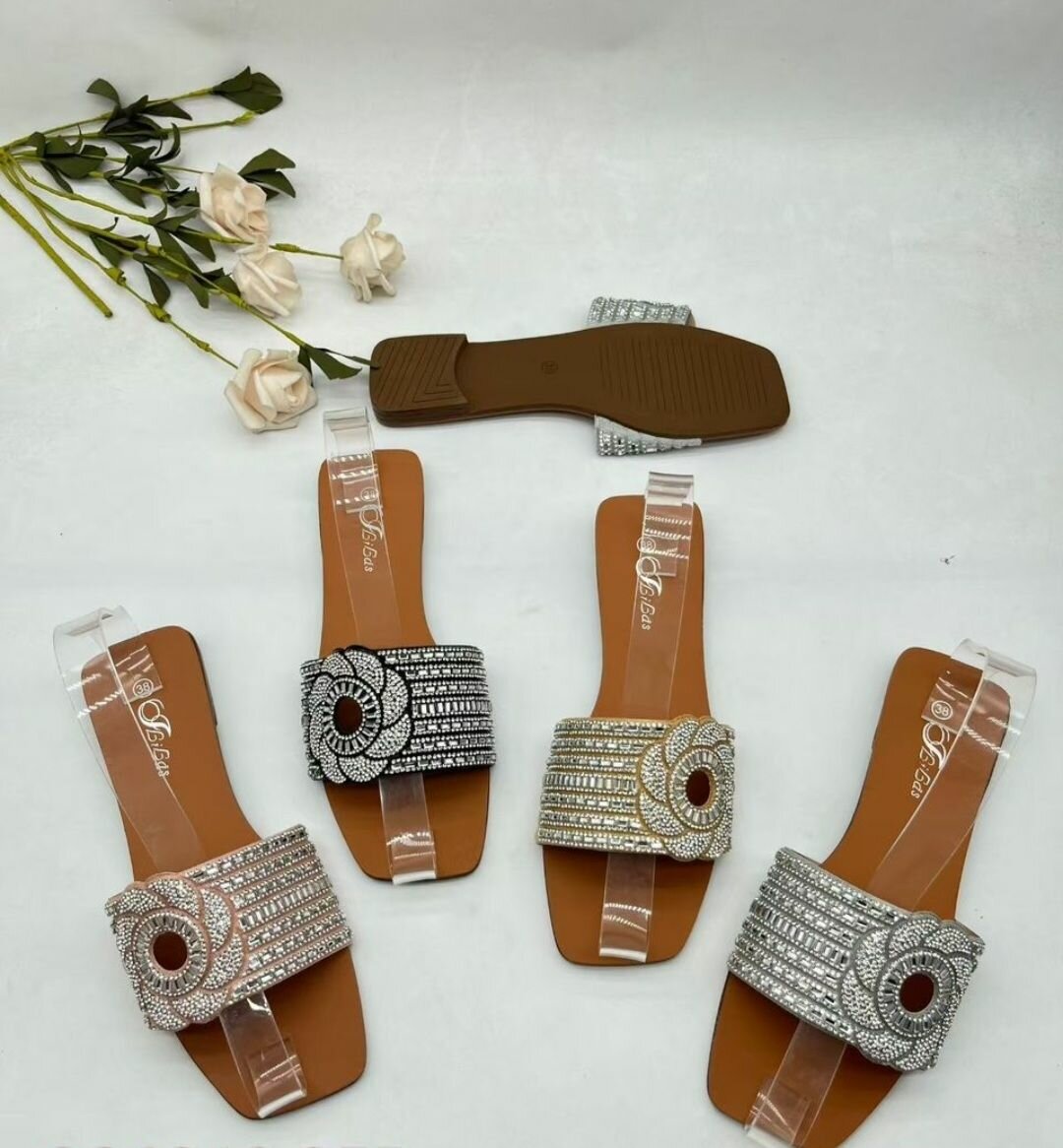 Découvrez ces sandales plates scintillantes parfaites pour l'été ! Elles combinent confort et élégance avec leurs ornements brillants. Idéales pour la plage ou une sortie en ville, elles rehausseront n'importe quelle tenue avec style.