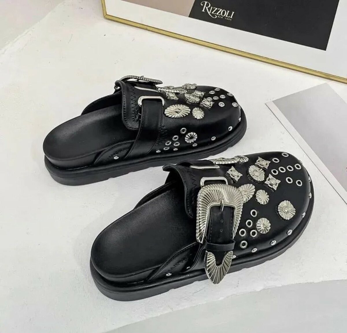 Découvrez nos sandales en cuir noir avec boucles décoratives, alliant confort et style. Parfaites pour un look audacieux cet été.