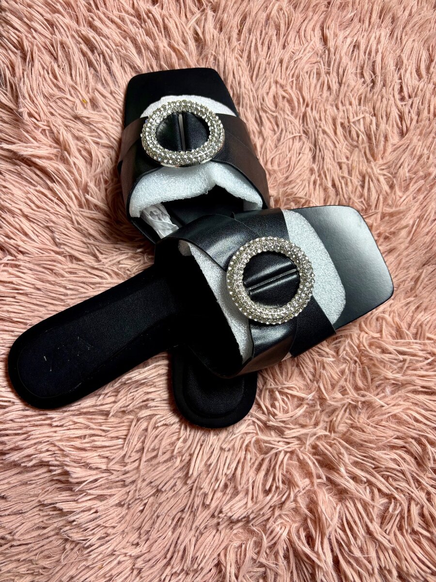 Ces sandales plates sont dotées d'une élégante boucle ornée de cristaux, ajoutant une touche de glamour à votre tenue. Parfaites pour une soirée chic ou une sortie décontractée, elles combinent style et confort.