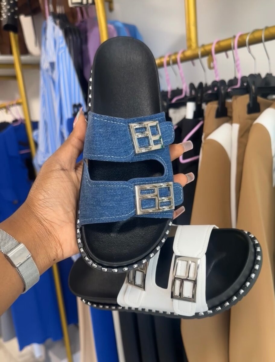 Sandales disponibles du 36 au 41, en bleu jean ou en blanc similicuir. Importés depuis la France.