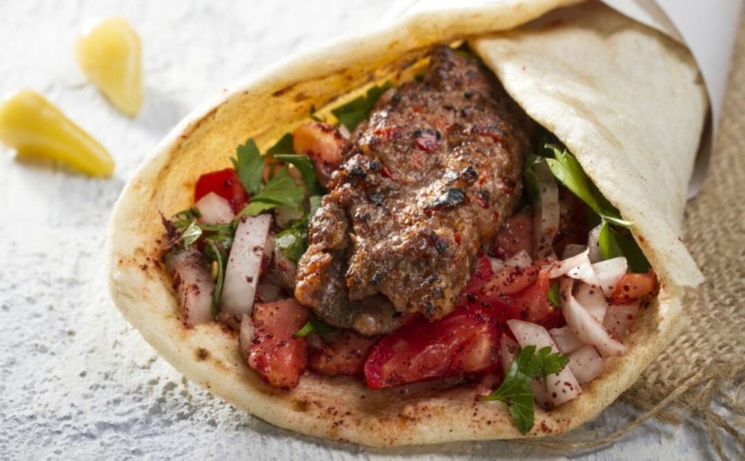 Viande hachée assaisonnée, grillée et servie avec tahini et légumes frais.