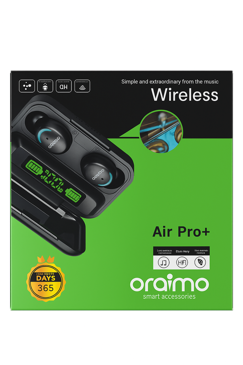 Profitez d'un son exceptionnel avec les écouteurs sans fil Oraimo Air Pro+. Design moderne, autonomie longue durée et boîtier de charge intelligent. Idéal pour musique, appels et sport