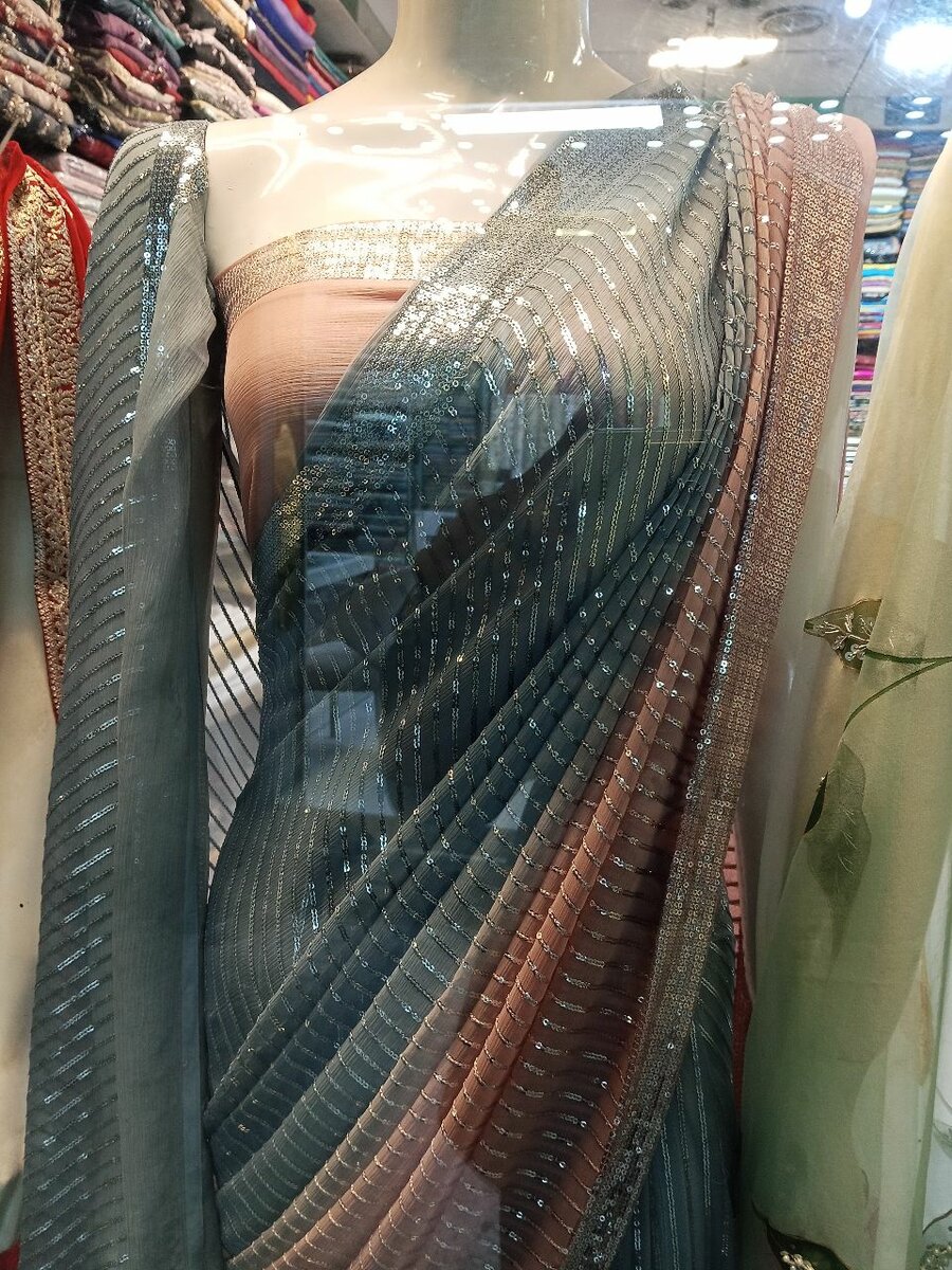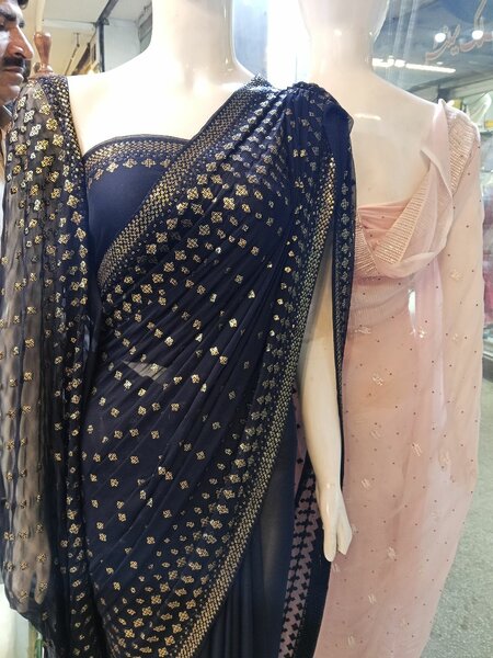 BLACK, GOLDEN, SAREE WITH GOLD SEQUIN BORDER WORK WITH BLOUSE ( Fabric Chiffion, Sequin, With Short Slvees, And Blouse Lenght 24 )