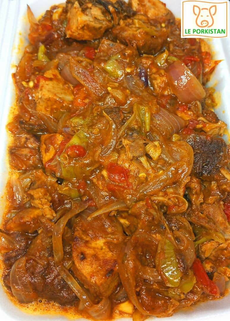 Savoureux Porc Sauté aux épices locales. Accompagnement Attiéké et Alloco au choix
