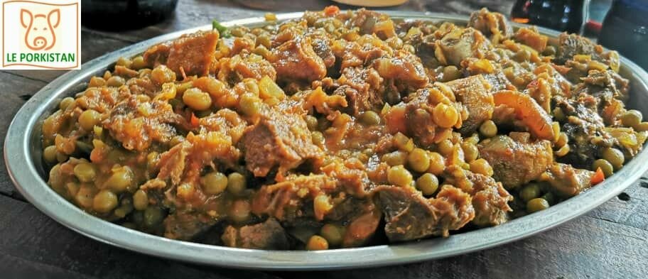 Délicieux Porc Sauté aux petit-pois. Accompagnement au choix : Pain - Attiéké - Alloco