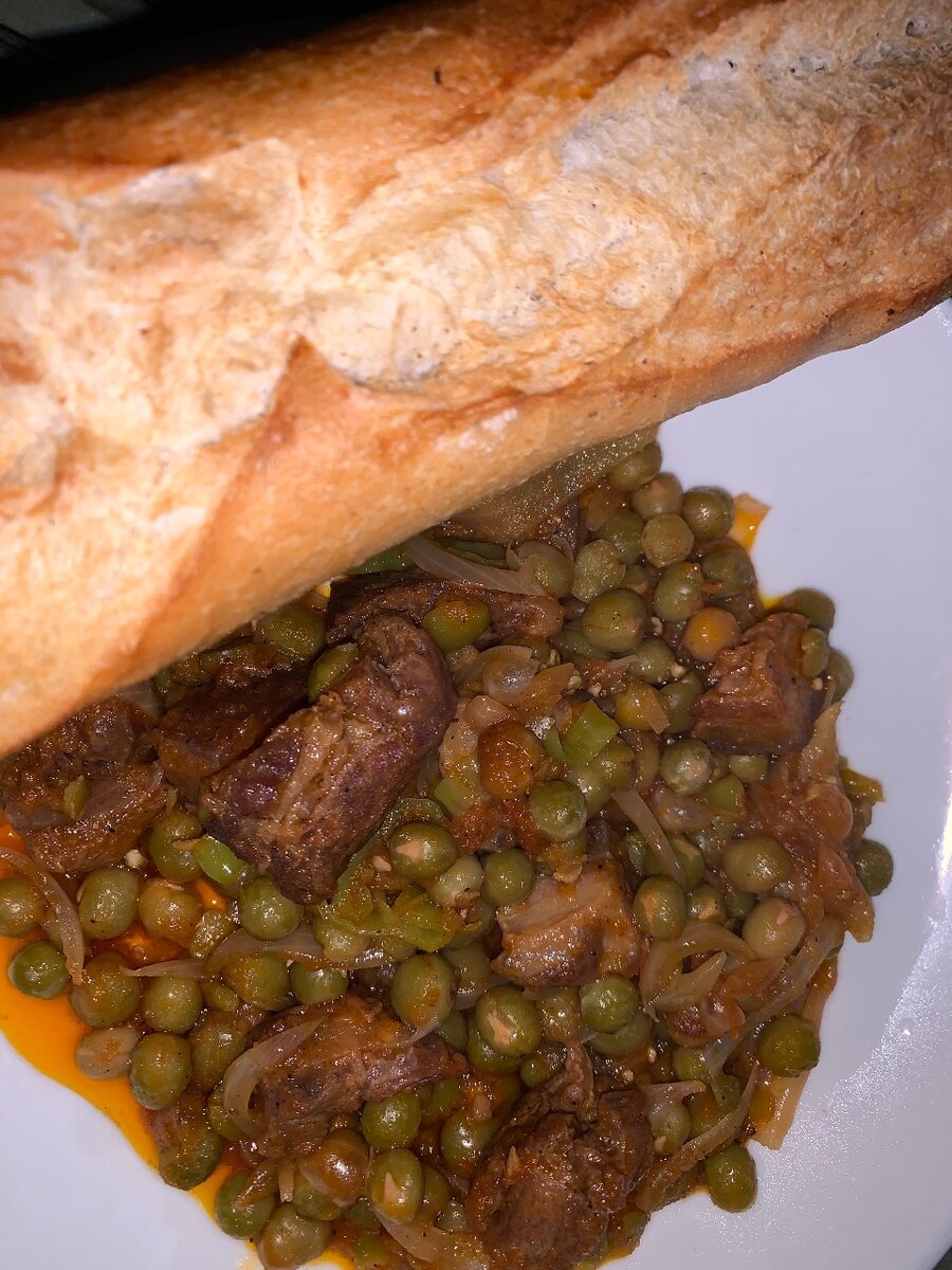 Savourez notre délicieux ragoût de viande tendre et pois, accompagné d'une baguette croustillante. Ce plat copieux est idéal pour un dîner en famille ou entre amis. Essayez-le pour une expérience culinaire réconfortante.