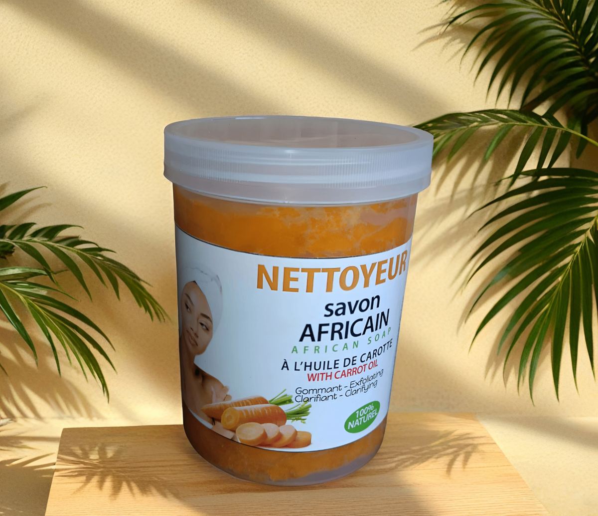 Découvrez notre savon africain Nettoyeur à l'huile de carotte, idéal pour tous types de peaux. Exfoliant et purifiant, il nourrit et illumine naturellement votre épiderme. Parfait pour un usage quotidien, ce savon est votre allié beauté pour une peau éclatante.