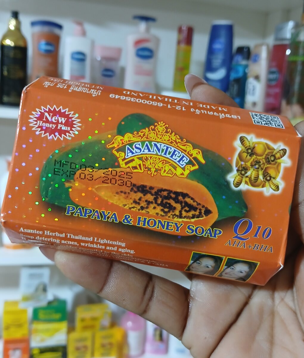 Savon Asantee à la papaye et miel enrichi en Q10 pour un teint éclatant. Idéal contre acné et rides.