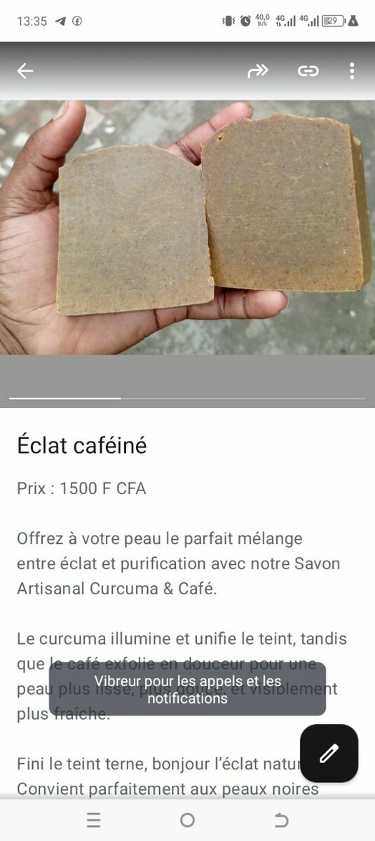Découvrez notre savon artisanal Éclat Caféiné, un mélange parfait de curcuma et café pour une peau éclatante et purifiée. Idéal pour illuminer et unifier le teint, il convient particulièrement aux peaux noires. Fabriqué à la main avec des ingrédients naturels, il offre une exfoliation douce et un délicieux parfum. Parfait pour un usage quotidien et une peau radieuse !